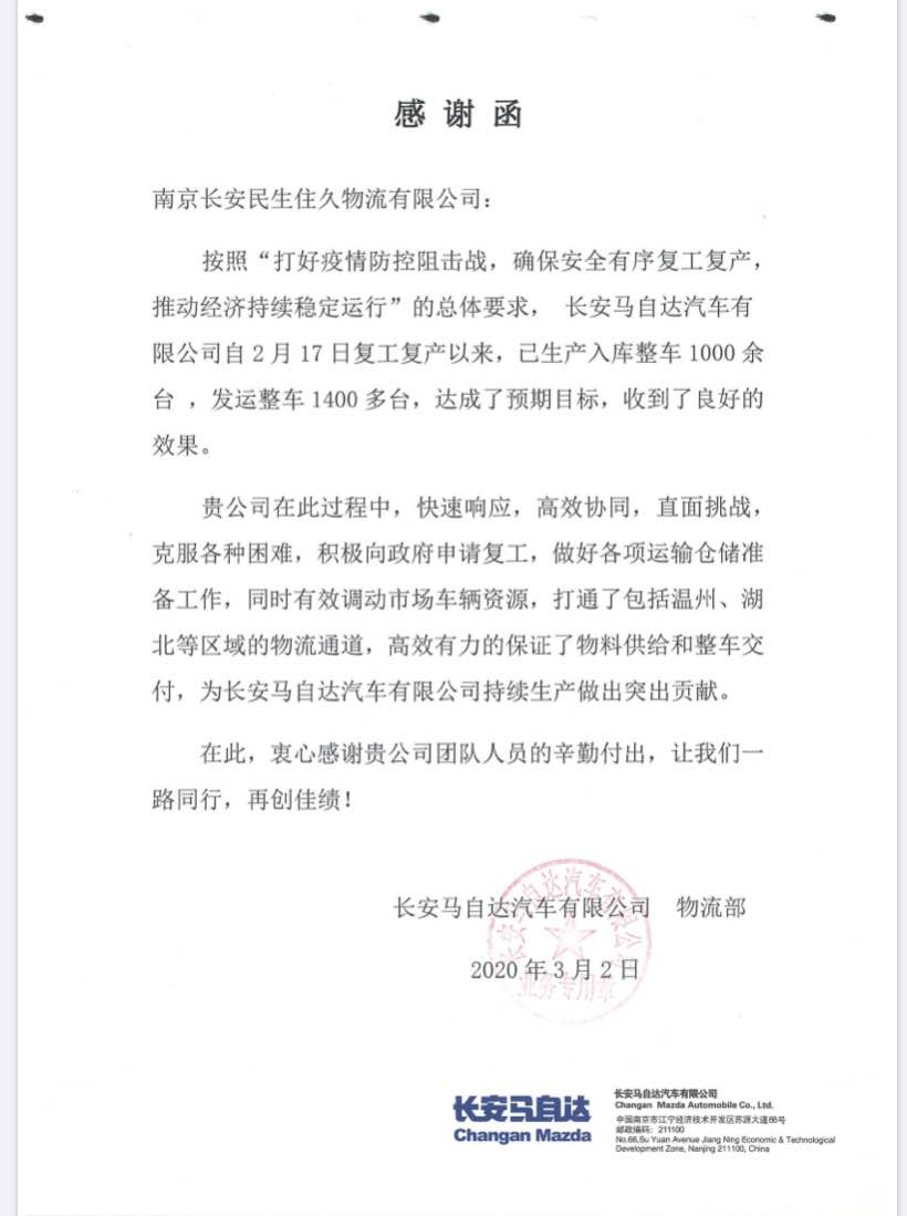 從2月26日早間(jiān)至28日晨間(jiān),短(duǎn)短(duǎn)48小(xiǎo)時(shí)內(nèi),長安民生(shēng)物流南京住久圓滿完成車(chē)燈運輸,用專業點“亮”黑(hēi)夜。同時(shí)也收到了來(lái)自馬自達的感謝信:“快速響應、高(gāo)效協同、直面挑戰......”字裏行(xíng)間(jiān)浸透着客戶對長安民生(shēng)物流專業、高(gāo)效的認可(kě),還(hái)透露出長安民生(shēng)物流與客戶攜手共克時(shí)艱的深厚情誼。