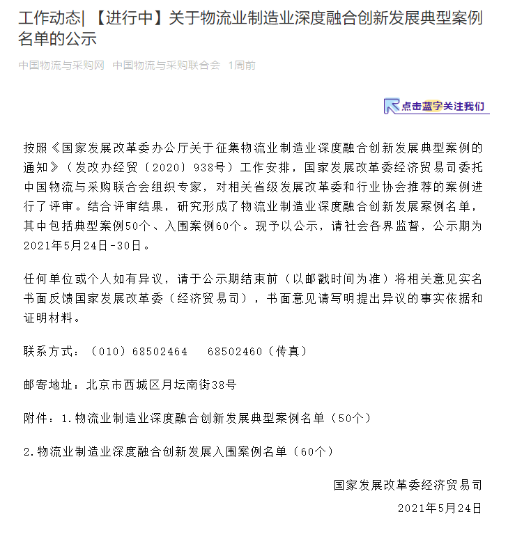 2020年12月14日,國家(jiā)發展改革委辦公廳為(wèi)貫徹落實黨中央、國務院有(yǒu)關決策部署,充分發揮典型案例示範引領作(zuò)用,推動物流業降本增效提質和(hé)制(zhì)造業轉型升級,按照《推動物流業制(zhì)造業深度融合創新發展實施方案》有(yǒu)關要求,組織征集物流業制(zhì)造業深度融合創新發展典型案例并推廣相關經驗。