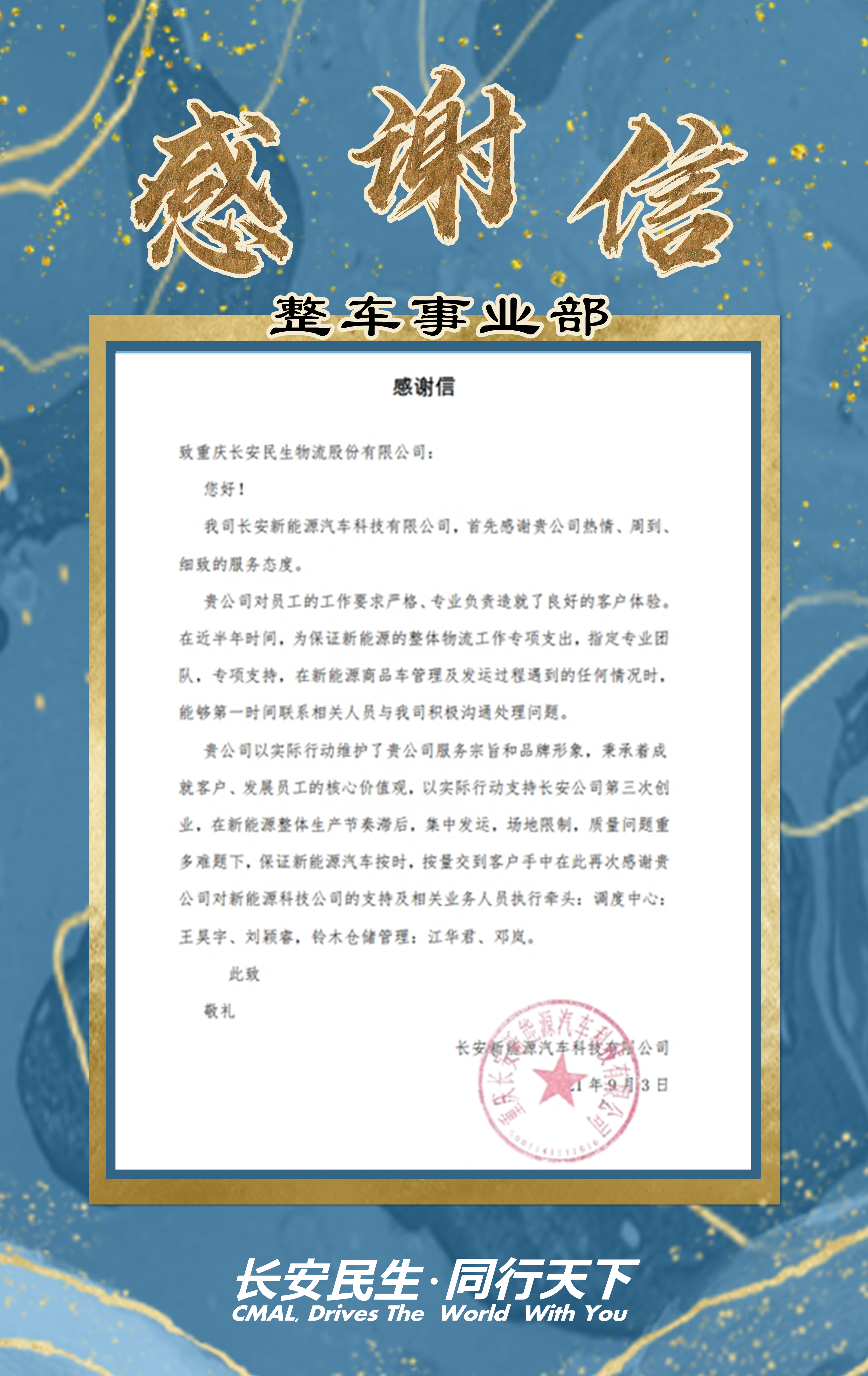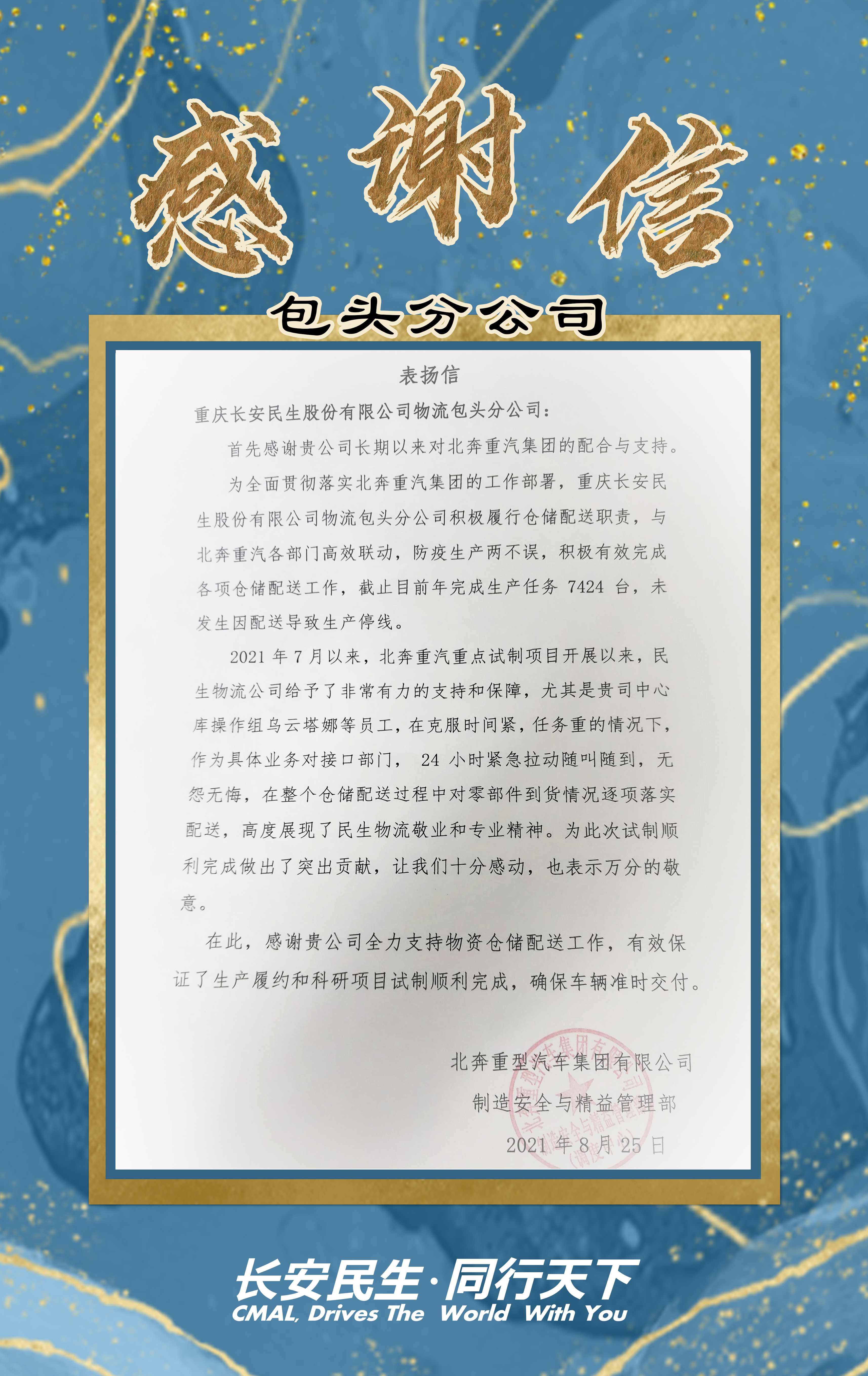 7月,客戶接到被譽為(wèi)北奔“1号工程” 項目。長安民生(shēng)物流包頭分公司全力保供,做(zuò)到了二十四小(xiǎo)時(shí)緊急拉動、随叫随到,在巨大(dà)壓力情況下将物資第一時(shí)間(jiān)交付,确保客戶生(shēng)産任務完成。 8月底,客戶發來(lái)表揚信,對我們的敬業及專業精神深受感動并給與高(gāo)度贊揚。