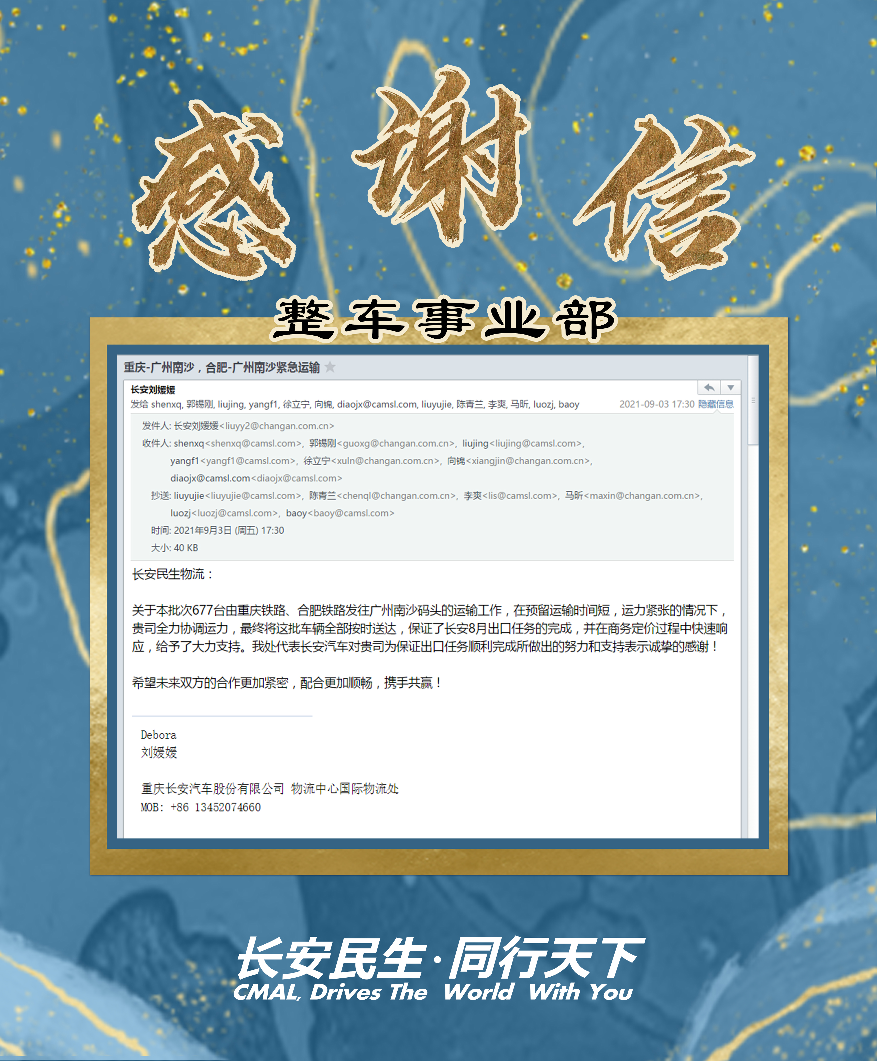 8月下旬,長安民生(shēng)物流接客戶通(tōng)知,需緊急發運近七百台車(chē)到廣州南沙碼頭。此次運輸業務任務重,時(shí)間(jiān)緊。整車(chē)事業部快速響應全力協調運力,最終将這批車(chē)輛(liàng)全部按時(shí)送達,保障了客戶的8月任務順利完成。随後,客戶對出口車(chē)任務順利的完成發來(lái)表揚信,這是對長安民生(shēng)物流人(rén)的肯定!